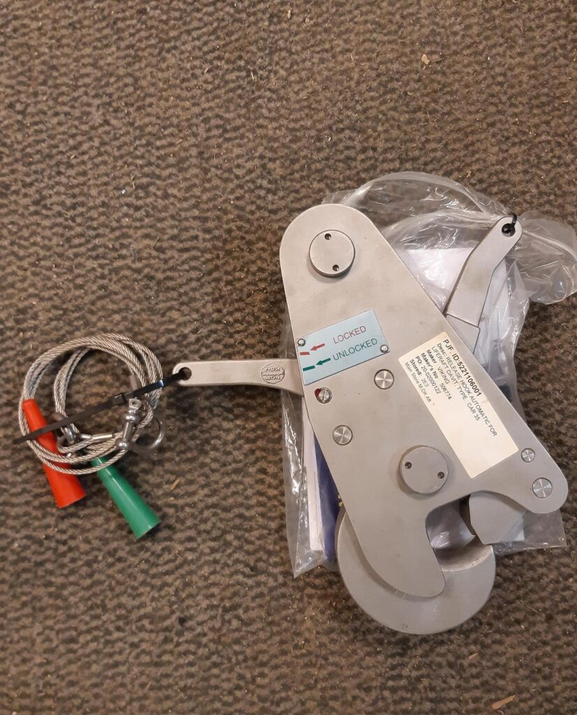 Description: The CAR 35 release hook meets the SOLAS standard for off-load release hooks and is dimensioned to suspend davit launched liferafts up to 40 persons and rescue boats with a davit load not exceeding 3.500kg. The red hand grip is designed for off-load release and the green hand grip is designed for on-load release.